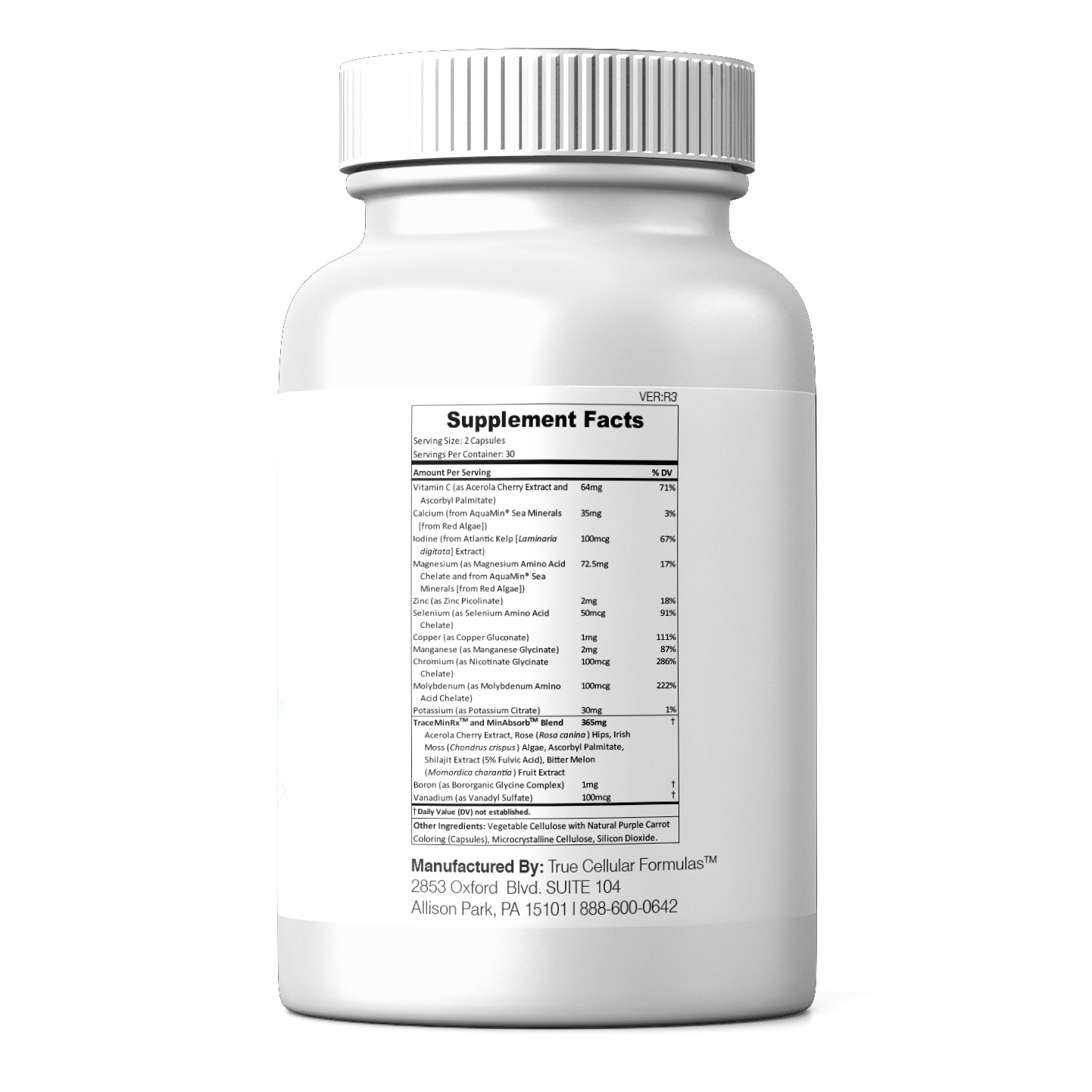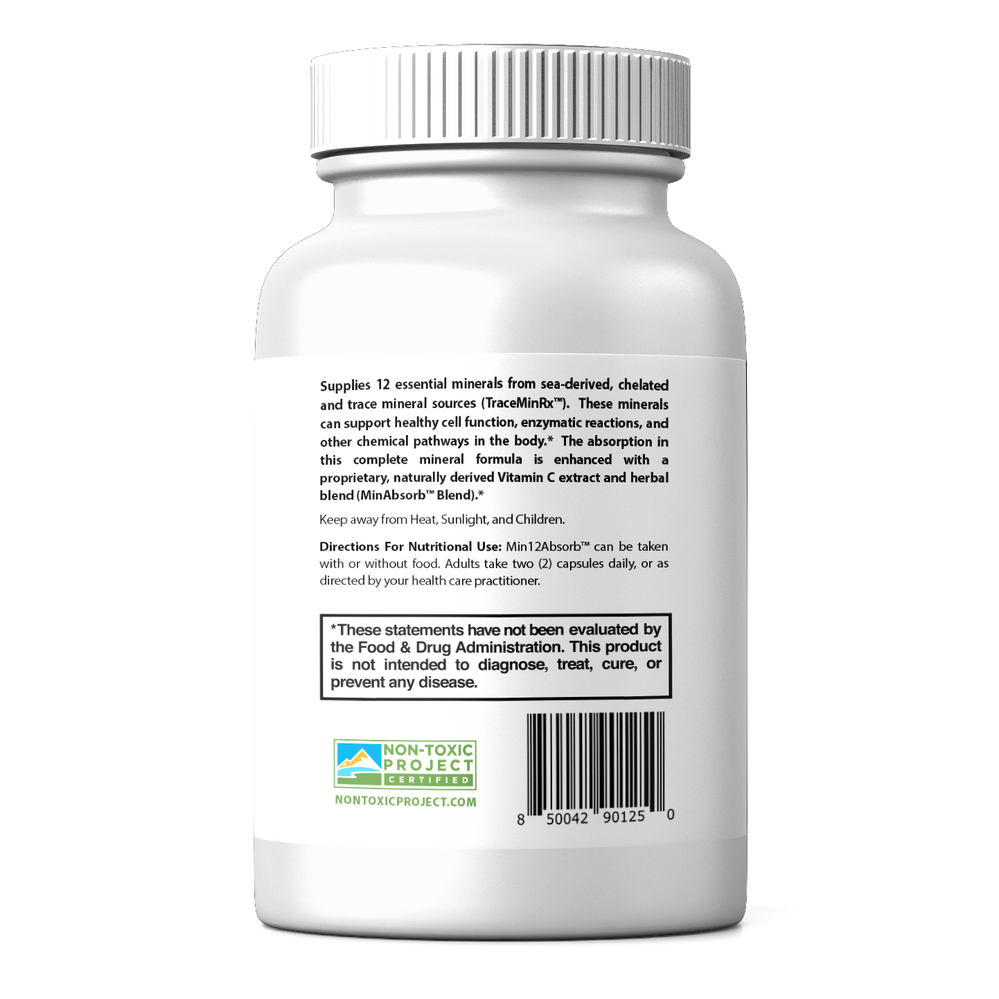 MIN12Absorb supplies 12 essential minerals from sea-derived, chelated, and natural trace minerals sources (Broad Spectrum Trace Minerals inside TraceMinRx™ Blend). These minerals are combined with our MinAbsorb™ technology to support overall nutrient absorption.